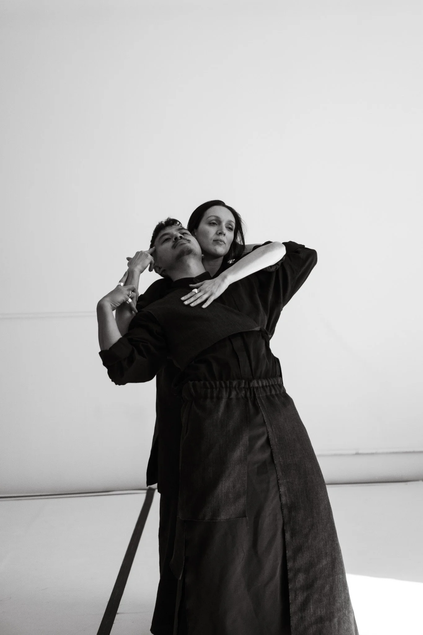La performance repose sur l’utilisation du langage chorégraphique de Charles, sa pratique “FLUIDIFY", mettant l'accent sur la fluidité des corps à travers la circularité et l’infinité du mouvement. Il s'agit de développer des corps fondants, presque gélatineux, en perpétuelle remodélisation, parfois se brisant intégralement, parfois trouvant une stabilité précaire. Le duo contraste avec la rigidité du chœur se déplaçant autour des deux protagonistes, créant un effet de masse mouvante, sans forme, en perpétuelle transformation.